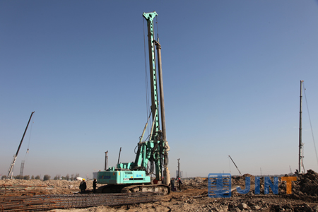 2010年10月4日,在上海金泰北京区域经理周定亮的引领下,记者一行来到了位于北京市昌平区回龙观的北京地铁8号线二期工程土建施工07合同段。北京地铁8号线二期工程土建施工07合同段为平西府车辆基地,位于8号线线路北端终点,与二期工程线路终点站回龙观东大街站接轨,平西府车辆段基地随二期工程建成。整个工程于2010年5月开工,计划于2012年底全部竣工并通车试运营。记者细数了一下,整个作业区总共汇集了6种品牌的旋挖钻机,其中来自上海金泰的SD20A型旋挖钻机表现格外抢眼。据周定亮介绍,要完成此工地的钻孔任务,其他品牌旋挖钻机的回转扭矩都需要在200kNm以上,只有上海金泰的SD20A型旋挖钻机在回转扭矩仅为200kNm完成了钻孔任务,而且成孔速度毫不逊色。