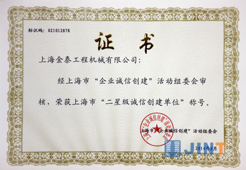 日前,从上海市“企业诚信创建”办公室获悉,上海金泰工程机械有限公司荣获上海市“二星级诚信创建单位”称号。这是金泰公司继去年被评为上海市“诚信星级企业”以来,诚信星级的再次提升。