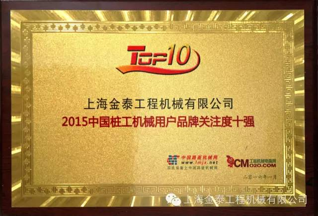新年伊始,中国工程机械电商网和路面机械网和在北京发布了《2015中国工程机械用户品牌关注度排行榜》。这是继2009年该榜单首次亮相以来第八年推出。上海金泰工程机械有限公司荣获2015中国桩工机械用户品牌关注度十强。