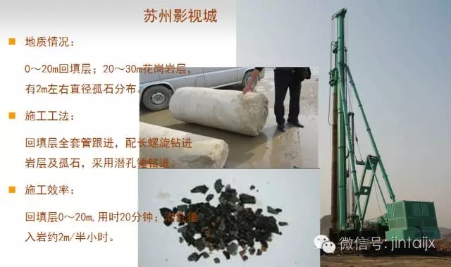 基于上述情况,项目部决定同时引进多种工法设备进行试桩,试桩的深度为该工程桩基础设计深度:14-35米不等,试桩结果如下表: