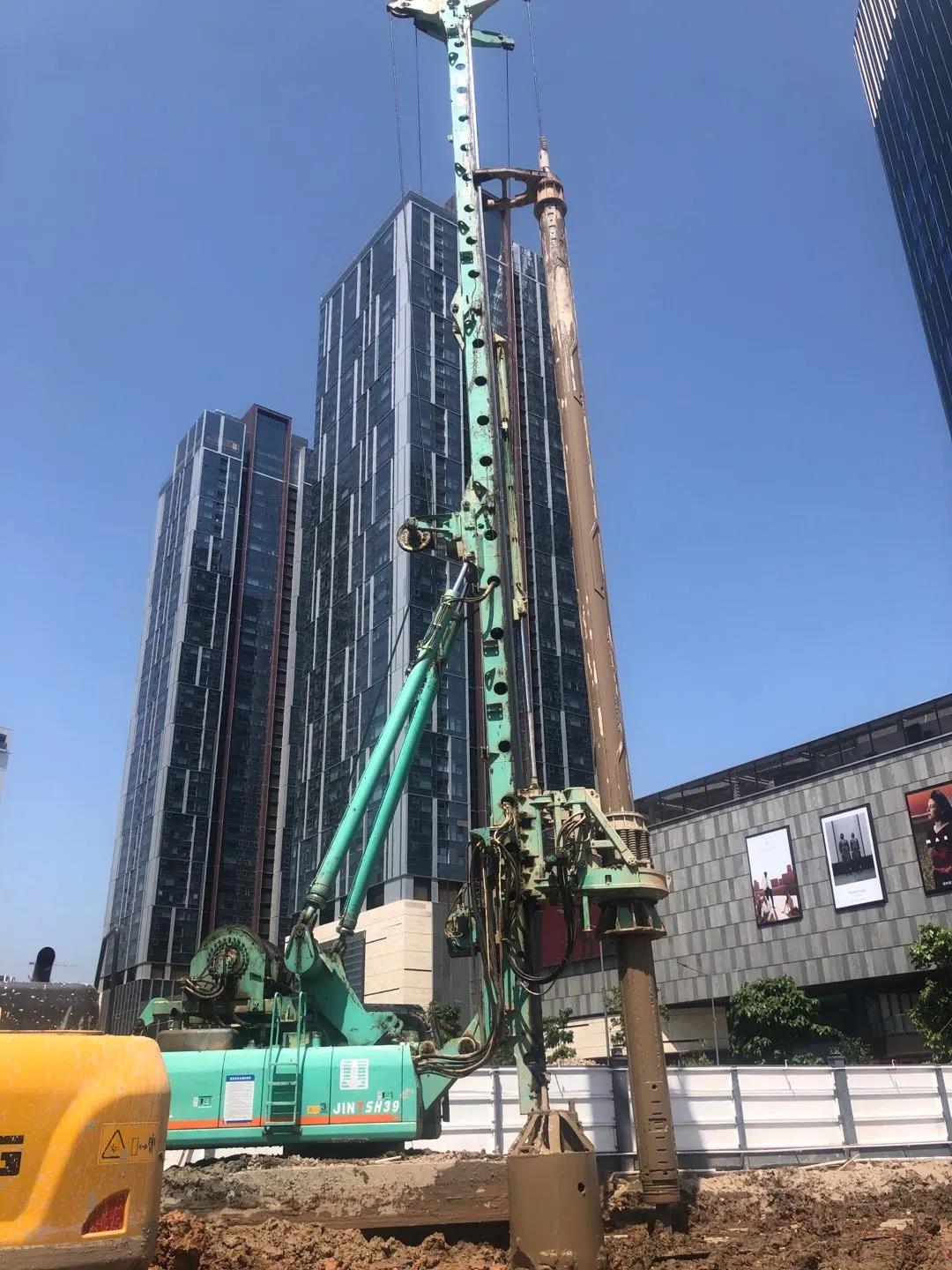 由于该工程工期紧且深圳当地对环保要求审核严苛。上海金泰携2台SH32A和1台SH39多功能旋挖钻机于4月6日进场施工。现场共有5台不同量级的旋挖设备同在C2地块进行施工。该工程前期采用咬合桩工艺施工,共600多根桩,目前以为完成540根桩。其桩径为1200mm,深度为27m。