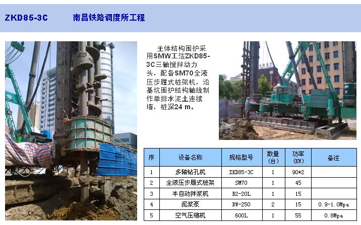 ZKD85-3C三轴钻孔机是使用SMW工法加固软土地基的施工设备,适合在城市高层建筑、地铁车站和地下室的挡土、防渗连续墙施工以及在江河堤坝、水利工程施工中进行防渗及软土地基加固等。